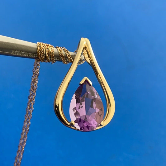 Designer RGE 10K Yellow Gold Pear Shaped Amethyst Drop Dangle Pendant Necklace