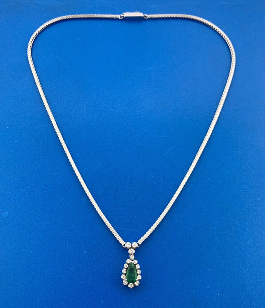 Gorgeous 18k White Gold Pear Cut Emerald Diamond Round Accent 16" Chain Necklace
