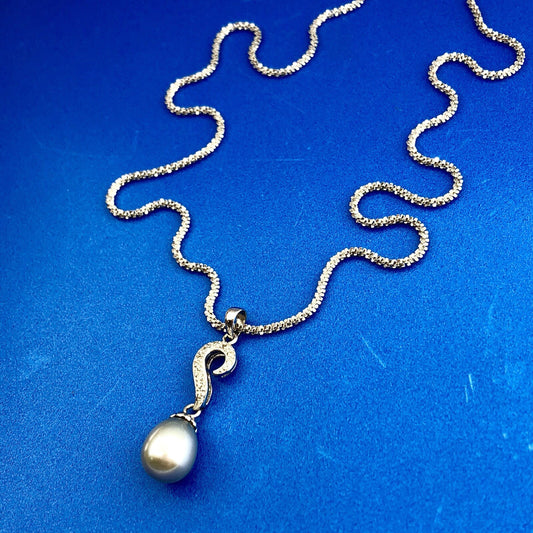 Retro 14K White Gold Gray Pearl Diamond Wedding Anniversary Sweetheart Necklace