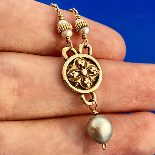 Mignon Faget 14K Yellow Gold Small Medallion Baroque Pearl Drop Toggle Necklace