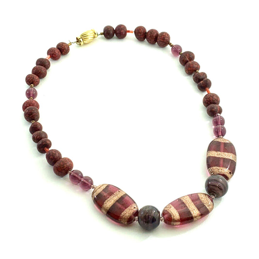Artisan 14K Yellow Gold Amethyst Art Glass Wooden Mixed Bead Necklace