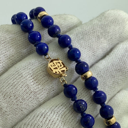 Designer 14K Yellow Gold Hand Knotted Lapis Lazuli Beaded Necklace