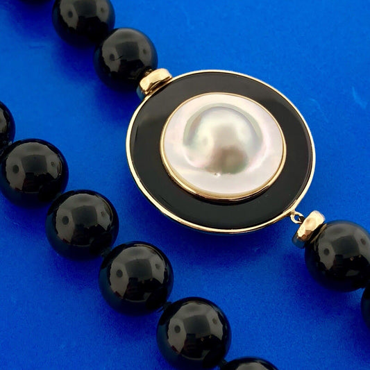 14K Yellow Gold Black Onyx Bead Mother Of Pearl Black White Modernist Necklace