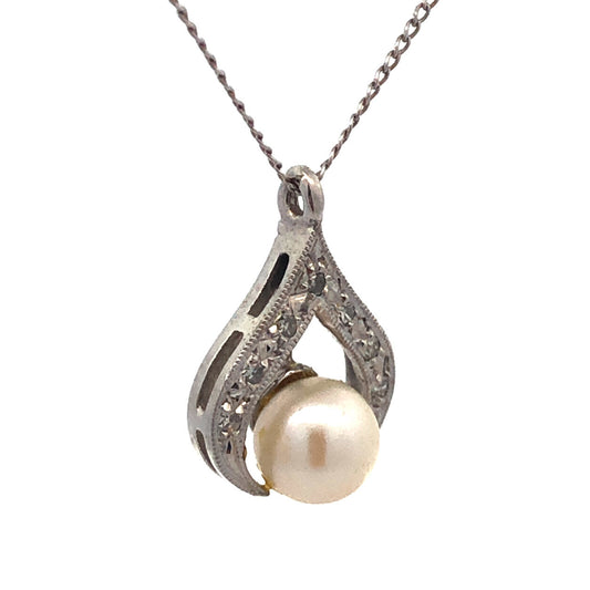 Designer 14K White Gold Pearl Diamond Bridal June Anniversary Pendant Necklace