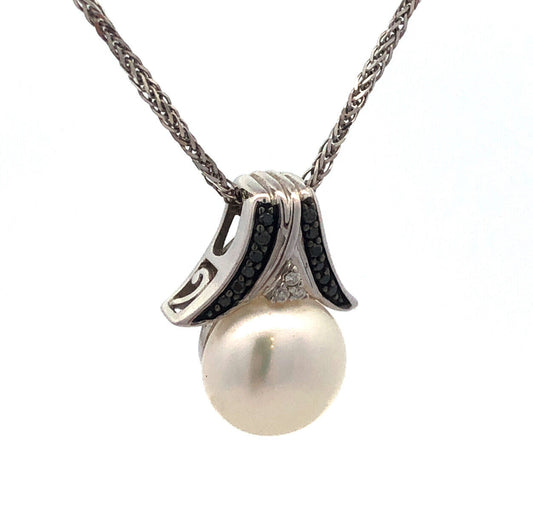 Elegant 14K White Gold Pearl Diamond Black Diamond Bridal Pendant Necklace