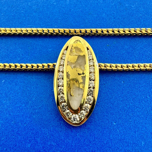 Designer 14K Yellow Gold Quartz w/Gold Vein Diamond Accent Oval Pendant Necklace