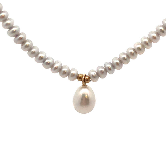 14K Yellow Gold Grey Button Pearl Beaded Drop Pearl Pendant Necklace