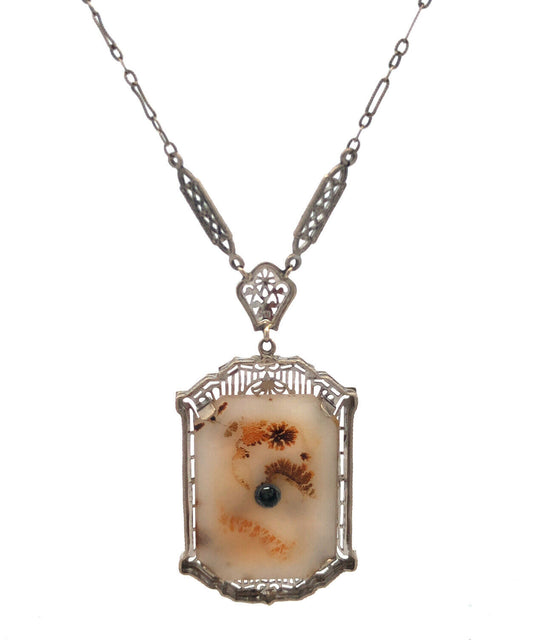 Antique 10K White Gold White Sapphire Aqate Filigree Statement Pendant Necklace