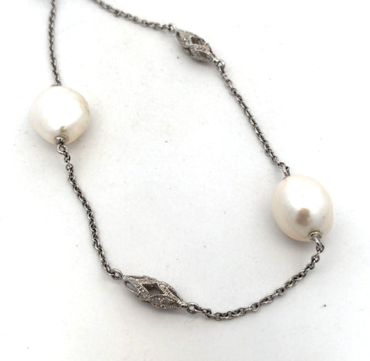 Estate 14K White Gold Art Deco Baroque Pearl Diamond Station Beaded Necklace