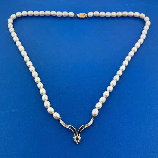 14K Yellow Gold Pearl Diamond Blue Sapphire Accented V Necklace
