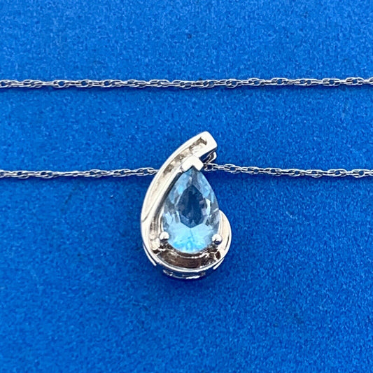 10K White Gold Pear Shaped Blue Topaz Diamond Accented Pendant Necklace