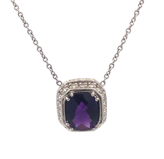 18k White Gold Faceted Purple Amethyst Diamond Accent 16.5" Chain Necklace