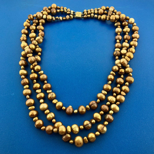 PJS 14K Yellow Gold Bronze Copper Pearl 3 Tier Drop Statement Necklace