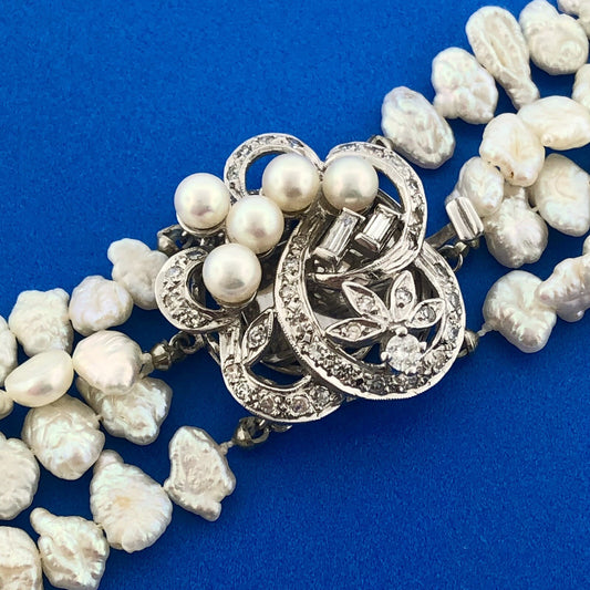 Gorgeous 14k White Gold Diamond Pearl & Keshi Pearl 4 Strand Statement Necklace