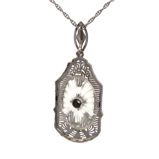 Vintage MSCo 14K White Gold Diamond Carved Art Glass Filigree Pendant Necklace