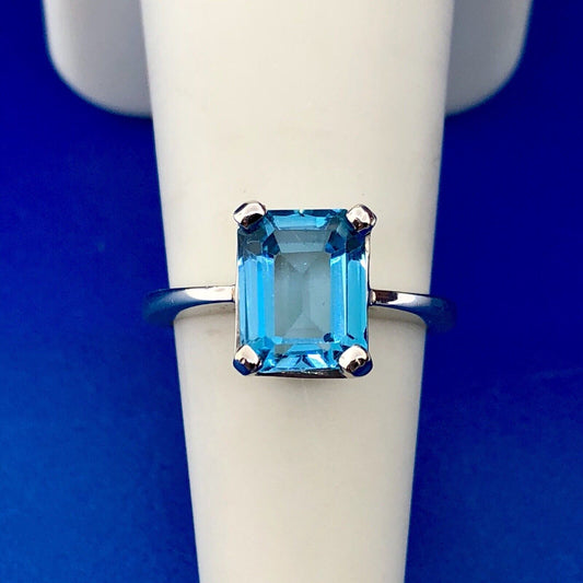 14K White Gold Emerald Cut Blue Topaz Solitaire Statement December Occasion Ring