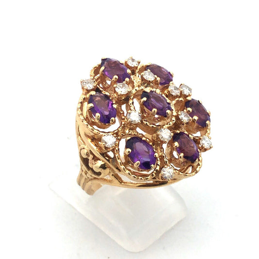 Vintage 14K Yellow Gold Amethyst Diamond Statement Anniversary Cocktail Ring