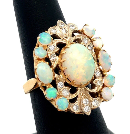 Designer 18K Yellow Gold Oval White Opal Diamond Art Deco Statement Ring
