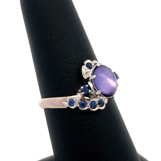 Estate 18K White Gold Oval Amethyst Cabochon Sapphire Accents Solitaire Ring