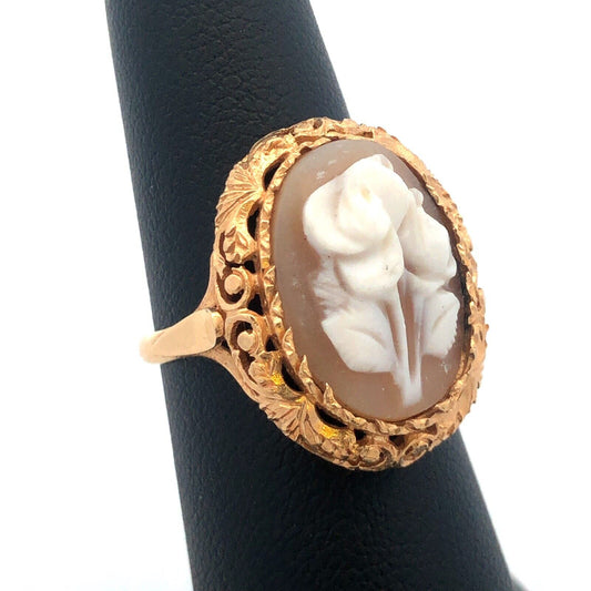 Vintage 14k Yellow Gold Carved Flower Oval Cameo Cocktail Ring Size 6.5