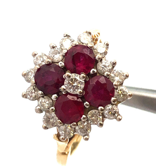 Estate Designer 18K Yellow Gold Ruby Diamond Flower Cluster Cocktail Ring