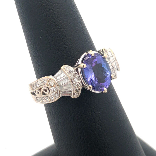 Designer 18K White Gold Oval Tanzanite Solitaire Diamond Accent Cocktail Ring