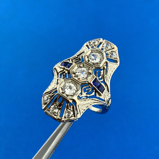 Art Deco Art Nouveau 18K White Gold Diamond Sapphire Filigree Statement Ring