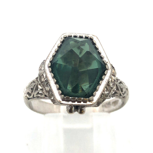 Stunning Art Deco 18K White Gold Hexagon Green Sapphire Statement Cocktail Ring