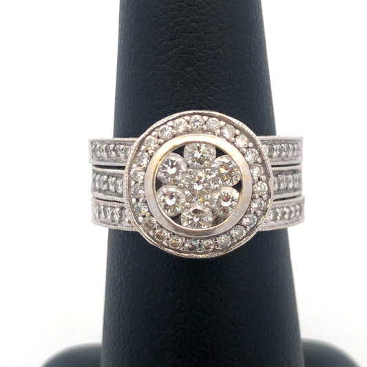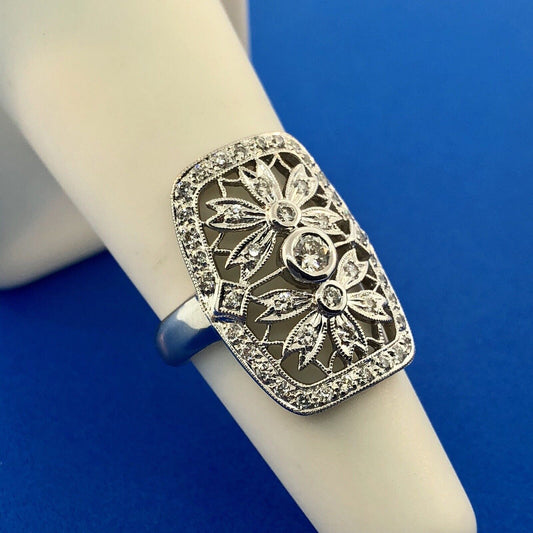 Vintage 18K White Gold Diamond Floral Filigree Statement Finger Ring