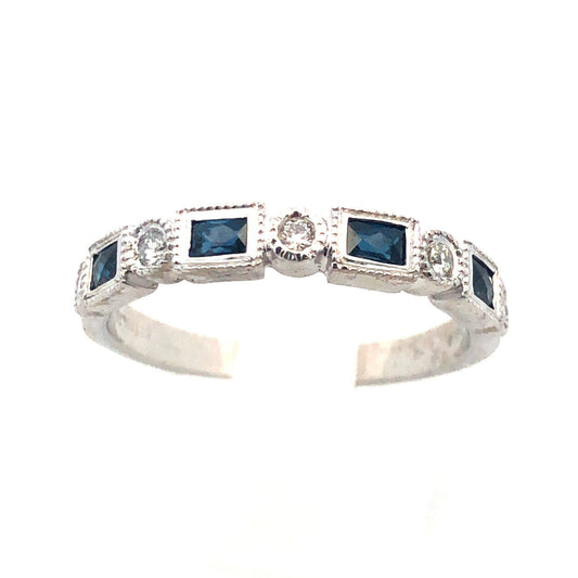 18K White Gold Emerald Cut Sapphire Round Diamond Stackable Anniversary Ring