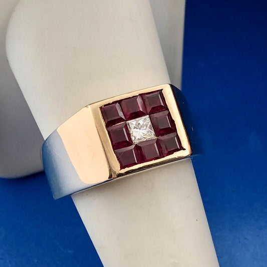 Retro 18K Yellow Gold Diamond Ruby Halo Channel Set Square Dome Unisex Ring