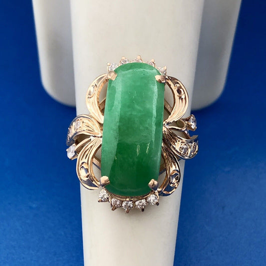 Retro 18K Yellow Gold Jade Jadeite Cabochon Cubic Zirconia Accent Cocktail Ring