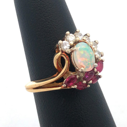 Vintage Gemco 18K Yellow Gold Opal Ruby Diamond Free Form Cocktail Ring