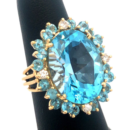 Designer 14k Yellow Gold Large Oval Blue Topaz Aquamarine Diamond Statement Ring