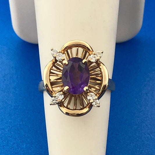 Gorgeous 14k Yellow Gold Oval Amethyst Round Diamond Radiant Dome Ring Size 4.75