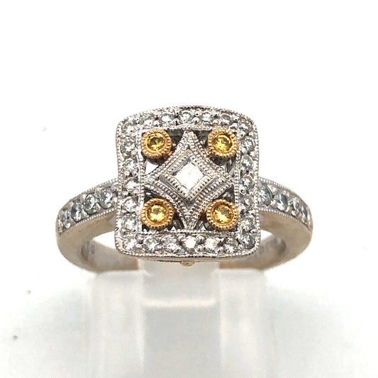 14K White Gold QJM Filigree Yellow White Diamonds Art Deco Style Statement Ring