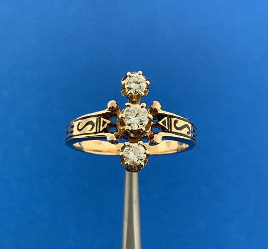Art Deco Heirloom 14K Yellow Gold Diamond Trio Black Enamel Cocktail Ring