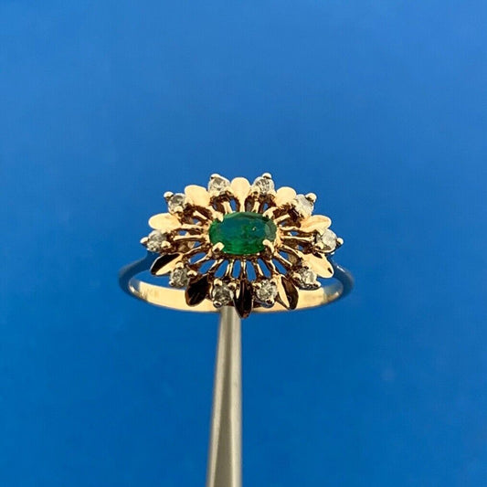 Vintage 14K Yellow Gold Oval Emerald Diamond Starburst Halo May Anniversary Ring