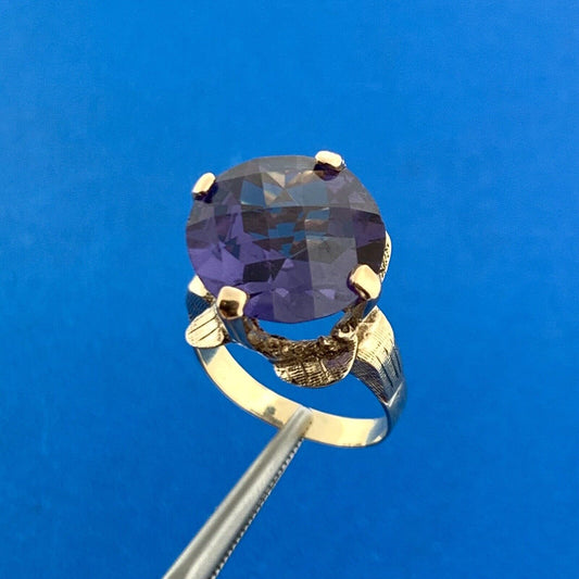 Vintage 14K Yellow Gold Round Cushion Purple Sapphire Solitaire Statement Ring