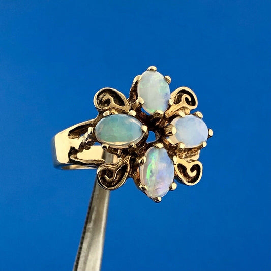 Mid Century 14K Yellow Gold Oval Opal Cabochon Floral Scroll Butterfly Ring