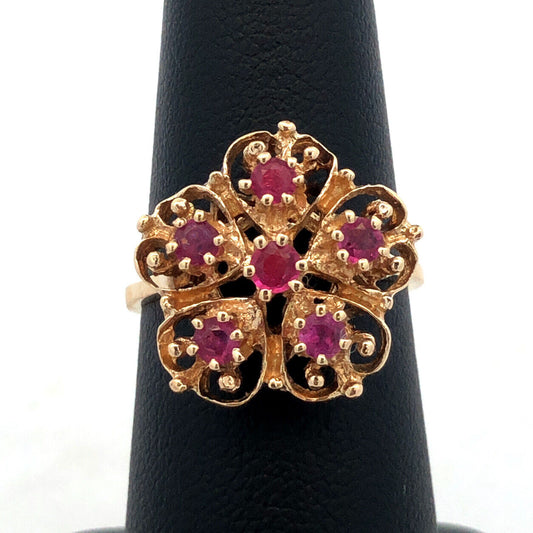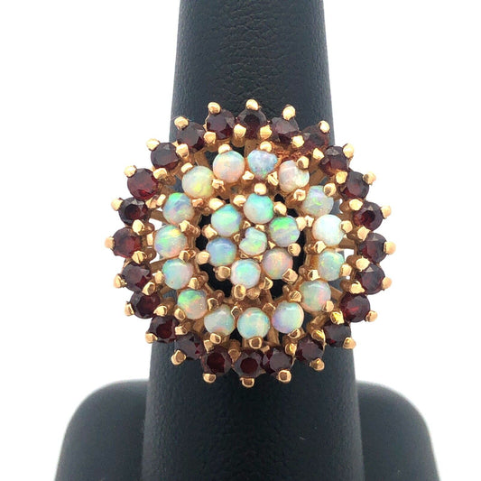 Lovely 14k Yellow Gold White Opal Garnet Floral Circle Cluster Dome Ring Size 7