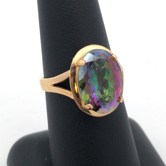14K Yellow Gold Oval Mystic Topaz Healing Good Luck Power Statement Ring