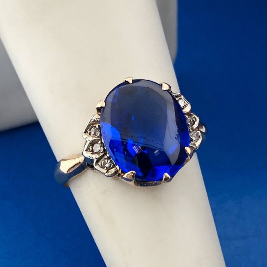 Retro 14K Yellow Gold Oval Blue Spinel Diamond Accented Statement Cocktail Ring