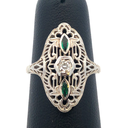 Designer Art Deco 14K White Gold Diamond Emerald Accent Filigree Cocktail Ring