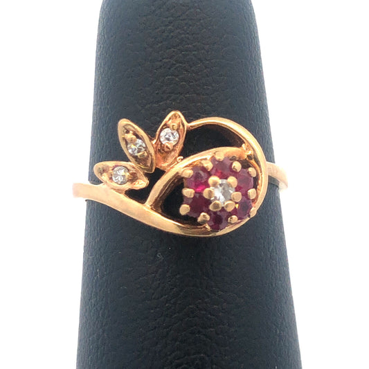 Vintage 10K Yellow Gold Ruby Diamond Free Form Rose Floral July Occasion Ring