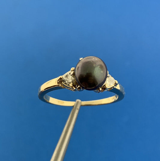 Gorgeous 14k Yellow Gold Black Pearl Trillion Diamond Accent Ring Size 6