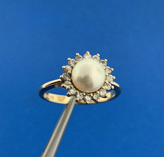 Estate 14K Yellow Gold Pearl Diamond Accented Modernist June Anniversary Ring