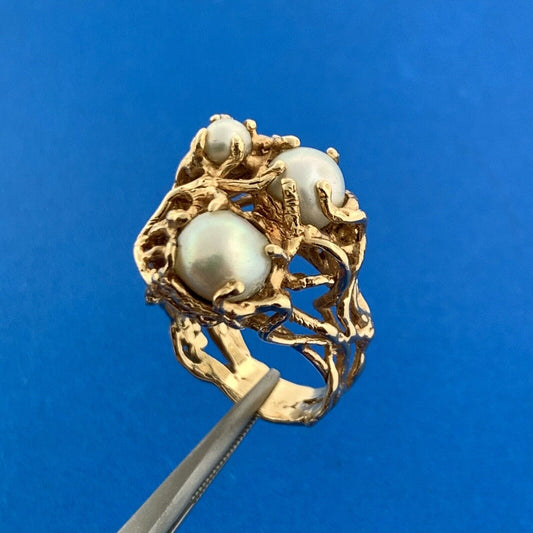 Gorgeous 14k Yellow Gold Triple Gray Pearl Openwork Branch Statement Size 7 Ring