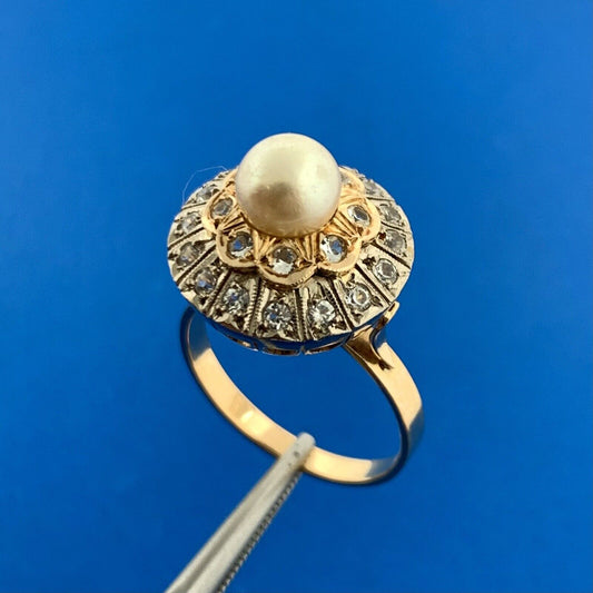 Vintage 18K Yellow White Gold Pearl White Amethyst Double Halo Tiered Ring