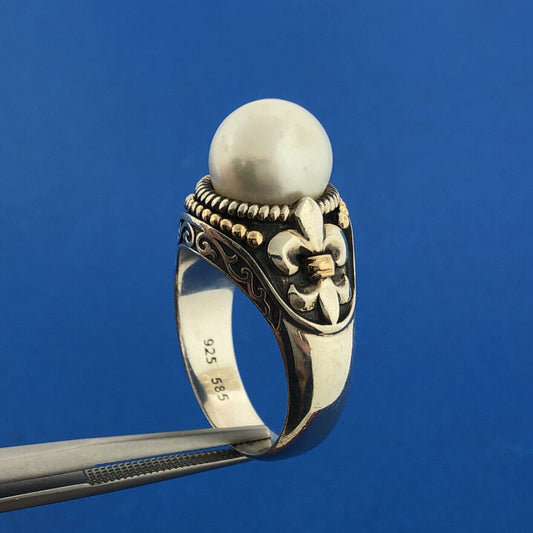 Designer HVE Sterling Silver 14K Yellow Gold Pearl Solitaire Fleur De Lis Ring